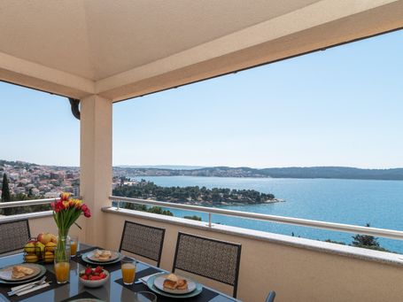 Genießen Sie den Balkon mit Meerblick oder gehen Sie an den 300m entfernten Strand Marinova Drage. Das Zentrum der Altstadt und den Yachthafen von Trogir erreichen Sie bequem zu Fuß in weniger als 1 km Entfernung.