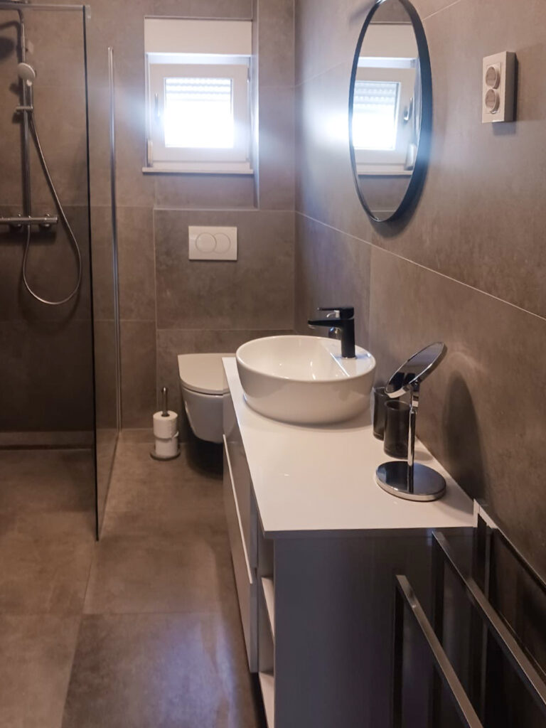 Bad mit Dusche, Fön, Ablage, Waschmaschine und ein extra gelegenes Gäste-WC.